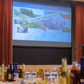 Verleihung Kulturlandschaftspreis am 13.10.2025 in Künzelsau: Willkommens-Folie auf der Bühne [Aufnahme: Foto Linke, Künzelsau]