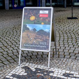 Verleihung Kulturlandschaftspreis am 13.10.2025 in Künzelsau: Stelltafel am Eingang zur Festhalle [Aufnahme: Foto Linke, Künzelsau]