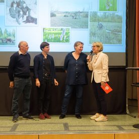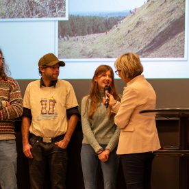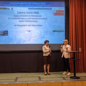 Verleihung Kulturlandschaftspreis am 13.10.2025 in Künzelsau: Jugebndpreisträger Bund Naturschutz Neckar Alb mit Moderatorin Petra Klein [Aufnahme: Foto Linke, Künzelsau]