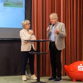Verleihung Kulturlandschaftspreis am 13.10.2025 in Künzelsau: Moderatorin Petra Klein und Jury-Vorsitzender Dr. Volker Kracht im Gespräch [Aufnahme: Foto Linke, Künzelsau]
