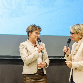 Verleihung Kulturlandschaftspreis am 13.10.2025 in Künzelsau: Moderatorin Petra Klein (re.) und Staatssekretärin Sabine Kurtz im Gespräch [Aufnahme: Foto Linke, Künzelsau]