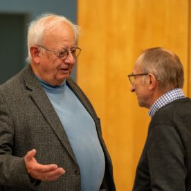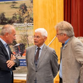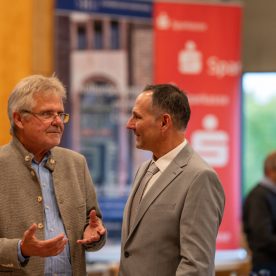 Verleihung Kulturlandschaftspreis am 13.10.2025 in Künzelsau: Reinhard Wolf (li.), Ehrenmitglied des Schwäbischen Heimatbundes und ehem. Vorsitzender der Jury, im Austausch mit einem Mitglied der Preisträgergruppe IG Die Schwäbische ObstArche [Aufnahme: Foto Linke, Künzelsau]