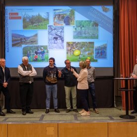 Verleihung Kulturlandschaftspreis am 13.10.2025 in Künzelsau: Preistr#ger IG Die Schwäbische ObstArche Fils-Alb mit Moderatorin Petra Klein und Jury-Vorsitzendem Dr. Volker Kracht (re.) [Aufnahme: Foto Linke, Künzelsau]