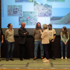Verleihung Kulturlandschaftspreis am 13.10.2025 in Künzelsau: Mitglieder des Jugendpreisträgers Bund Naturschutz Neckar-Alb mit Moderatorin Petra Klein [Aufnahme: Foto Linke, Künzelsau]
