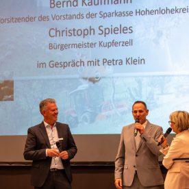 Verleihung Kulturlandschaftspreis am 13.10.2025 in Künzelsau: Bernd Kaufmann, Vorsitzender des Vorstands der Sparkasse Hohenlohe (li.) und Christoph Spieles, Bürgermeister der Gemeinde Kupferzell im Gespräch mit Moderatorin Petra Klein [Aufnahme: Foto Linke, Künzelsau]